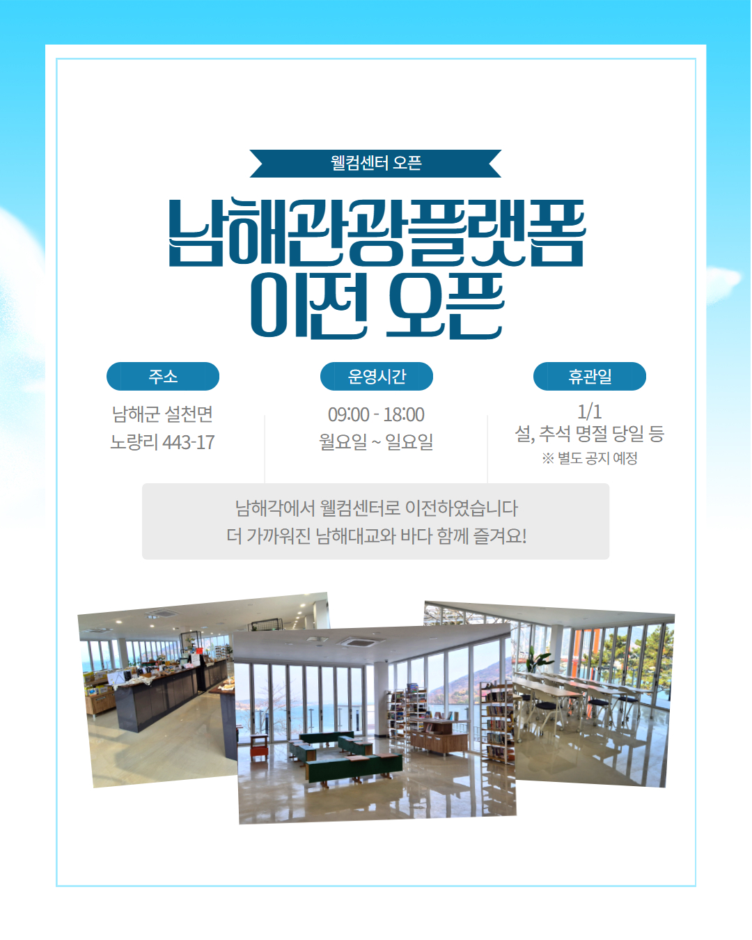 📌남해관광플랫폼 - 주소: 남해군 설천면 노량리 443-17 - 운영: 매일 9-18시 - 휴관: 1/1, 설, 추석 명절 당일 등 * 휴관일 별도 공지 예정