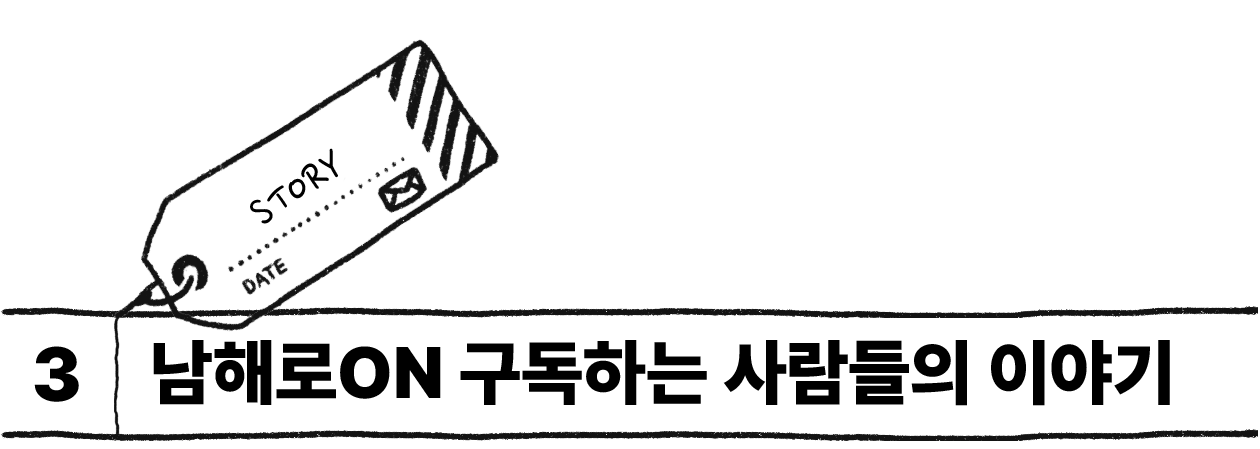 “부럽습니다. 저도 언젠가는 꼭 남해에서 살 겁니다.” 남해로ON을 읽으며 삶의 상상을 시작하신 분이 있다는 사실이 인상 깊었어요. 남해가 ‘언젠가의 선택지’가 되었다는 것만으로도 이 뉴스레터의 역할은 충분하다고 느꼈습니다.
