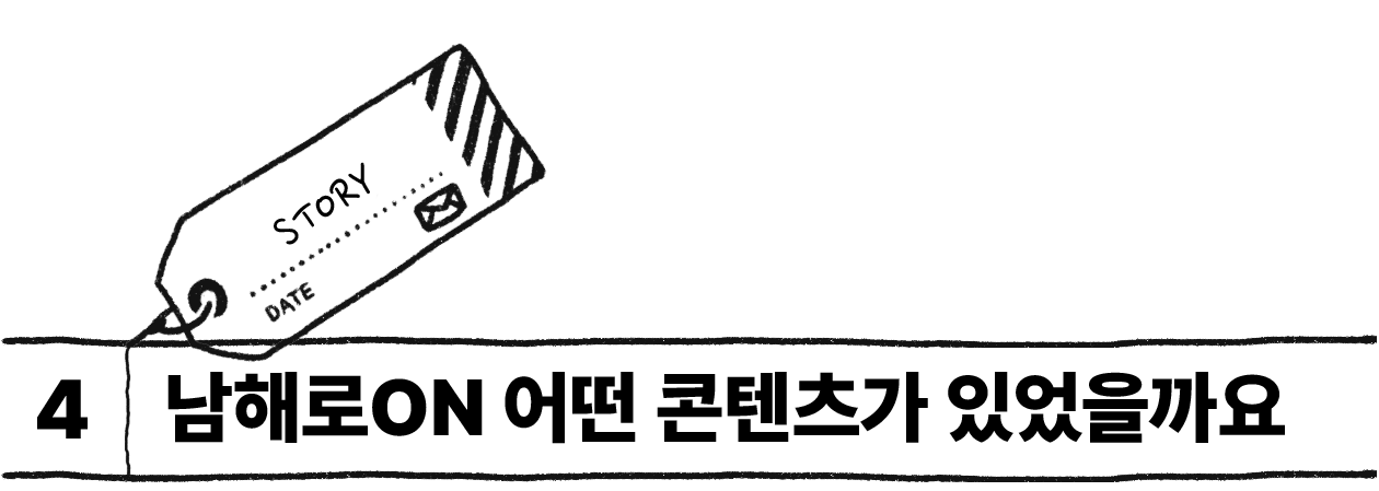 남해는 여행하기 정말 좋은 곳입니다. 자연풍광이 아름답고 매력도 분명하죠. 이 좋은 곳을 저만 알고 있기엔 아까웠고, 남해를 알리는 일이 저와 우리 팀의 미션이었습니다. 알리는 방법은 많았지만, 휘발성 메시지나 화려한 문구보다는 남해의 이야기를 담고 싶었어요.
